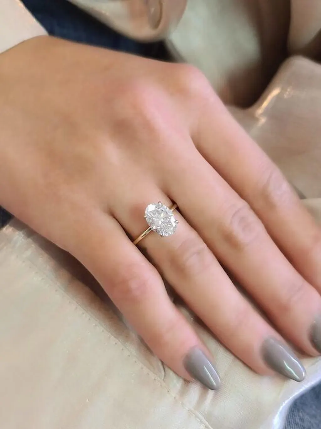 What makes her ring stand out is the balance between contemporary chic and traditional sophistication. The slender gold band enhances the diamond’s size and brilliance without distraction, while the oval shape adds a soft, romantic charm.