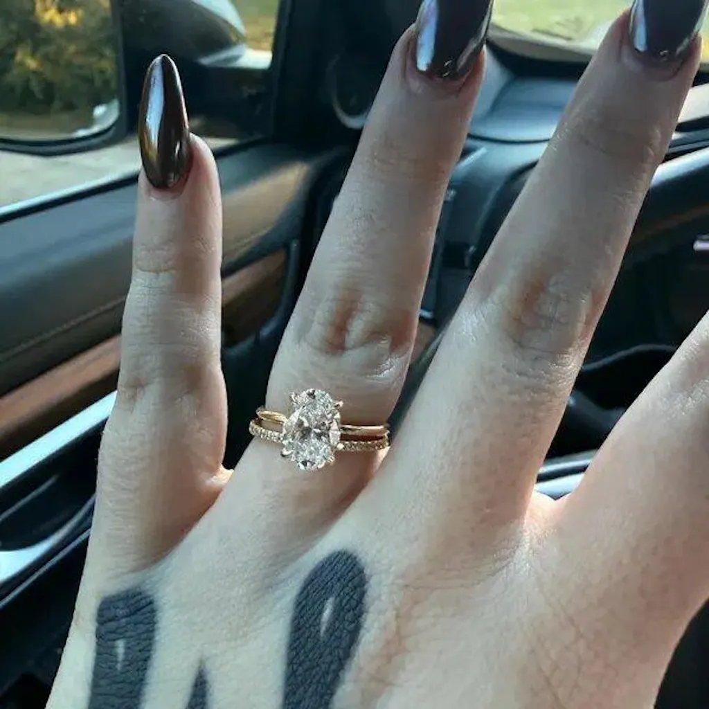 Hailey Bieber’s engagement ring is a solitaire oval-cut diamond set on a thin 18k yellow gold band. It’s timeless, elegant, and completely on-trend. The simplicity of the band allows the diamond to shine as the focal point.