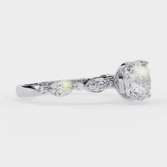 Celebrate love and commitment with our Cushion Solitaire with Accent Engagement Ring, a captivating blend of classic elegance and modern brilliance. This exquisite ring features a stunning cushion cut center stone that radiates with brilliance, while the delicate accent stones along the band enhance its sparkle, creating a breathtaking statement of love.