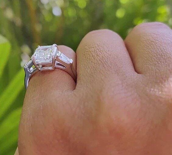 At its center, a mesmerizing cushion cut diamond or moissanite captures the light with its soft, rounded edges and exceptional fire. Complementing it, two sleek baguette cut side stones add a touch of sophistication, creating a balanced contrast between sparkle and refinement. This three stone setting beautifully represents the journey of love—past, present, and future.