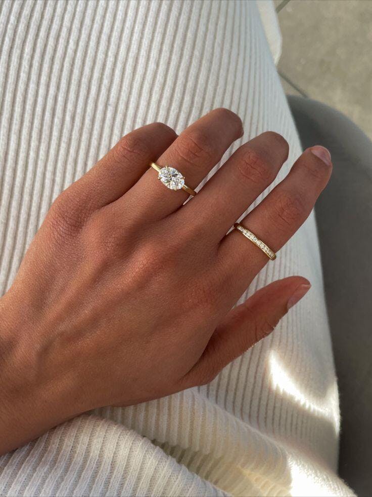 An East-West oval diamond solitaire ring is the perfect blend of classic sophistication and contemporary style. Unlike traditional settings, this design places the oval diamond horizontally across the band, creating a sleek and distinctive look. Its unique orientation enhances finger coverage while maintaining the brilliance and elegance of a solitaire ring.