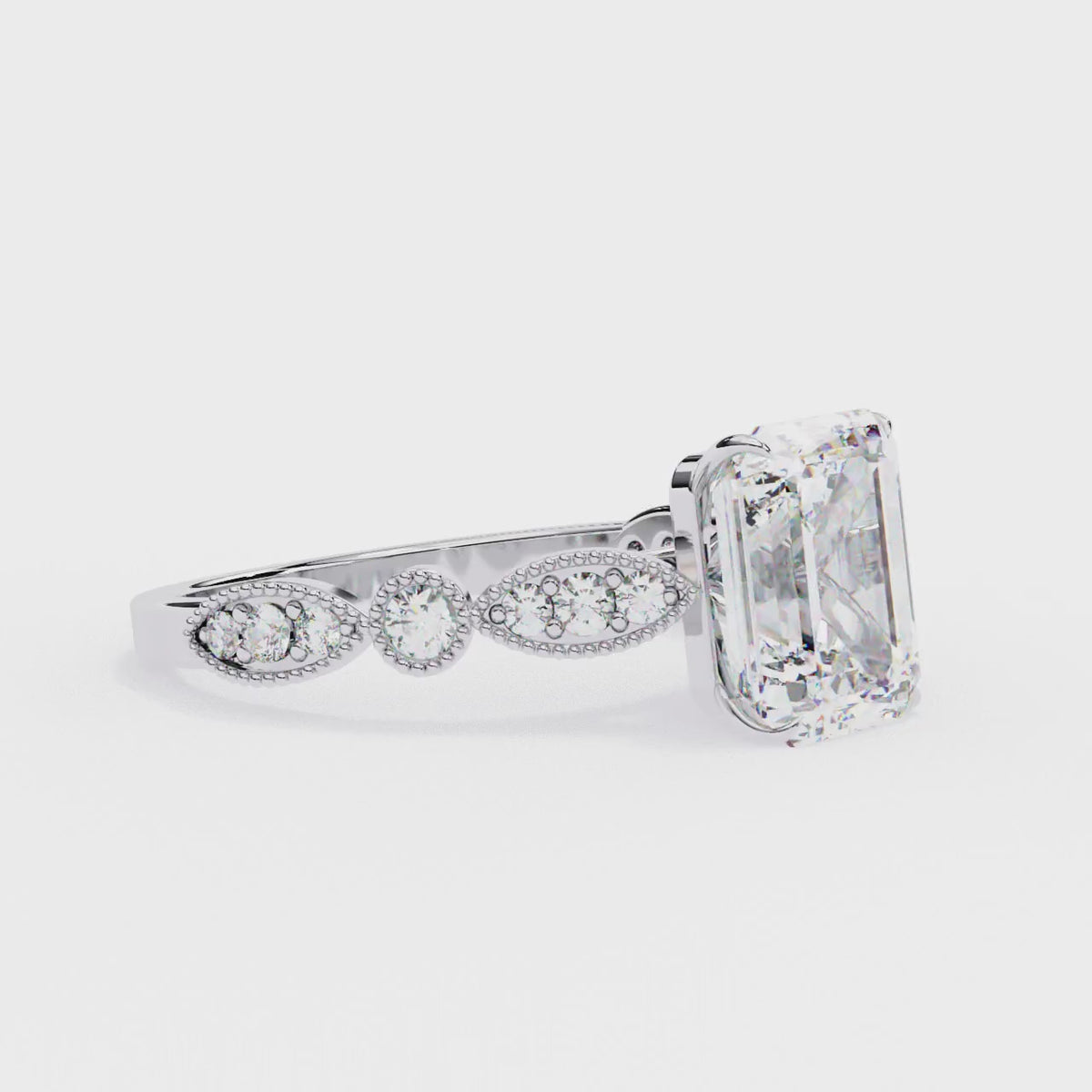 The cathedral setting enhances the beauty of the emerald-cut diamond by elevating it in a graceful arch. The design mimics the soaring arches of a cathedral, creating a sense of grandeur and strength.