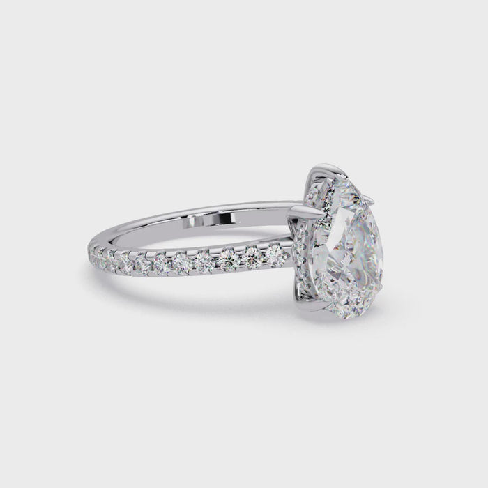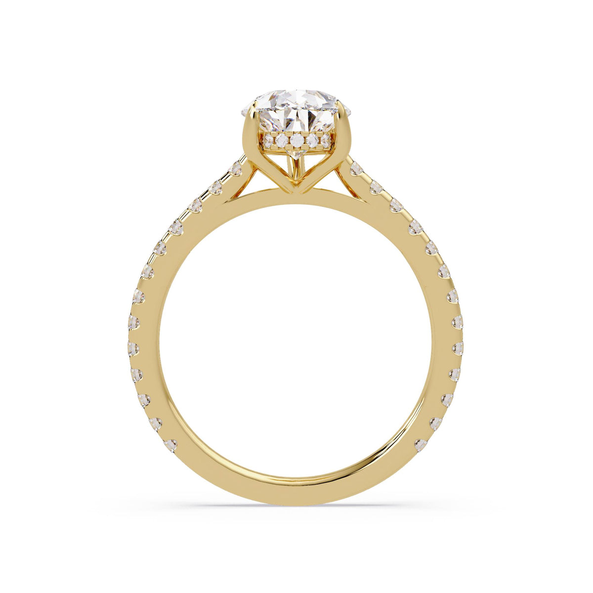 The pear shape, known for its graceful teardrop form, offers a flattering lengthening effect on the finger. When combined with a hidden halo, it enhances brilliance in a subtle yet luxurious way. The halo remains discreetly tucked beneath the center stone, catching light with every movement and giving the ring a radiant, floating appearance.