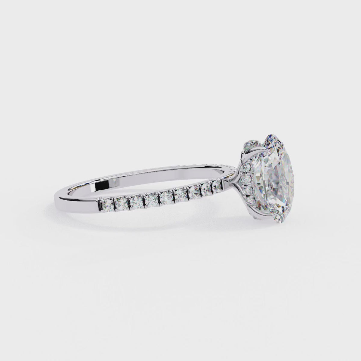 The oval shape elongates the finger and maximizes sparkle, while the hidden halo subtly enhances brilliance beneath the center stone, creating a radiant glow from within. The pavé band adds continuous shimmer, giving the ring a luxurious, high-fashion feel.