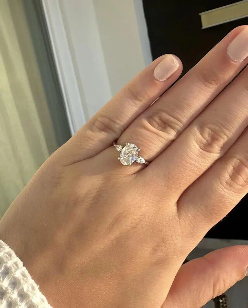 A Trilogy of Teardrops: The Oval with Pear Three Stone Engagement Ring