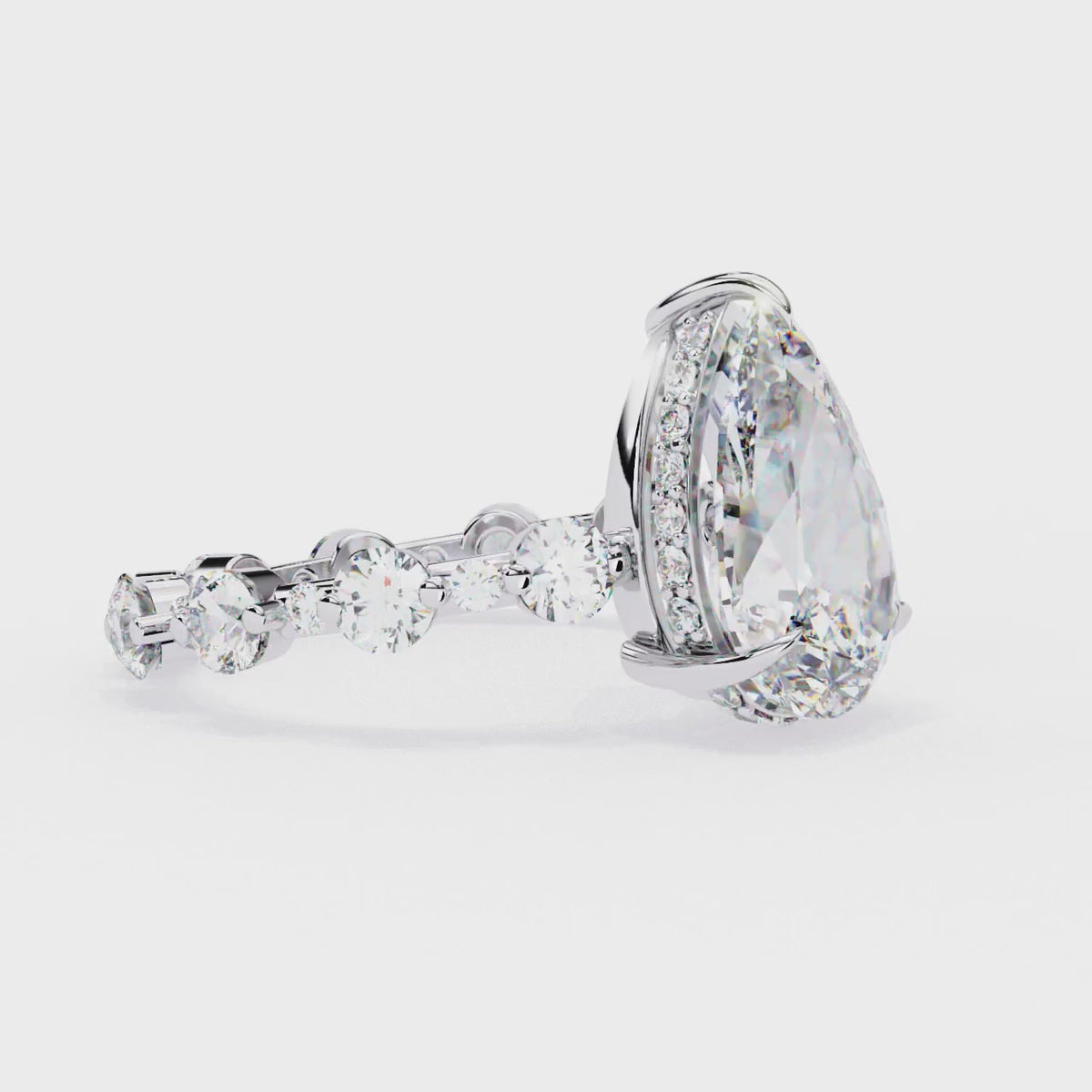The pear-cut diamond or Moissanite is known for its teardrop shape, symbolizing love and emotion. The hidden halo sits discreetly beneath the center stone, reflecting light to enhance its brilliance. The shared prong setting allows for minimal metal visibility, ensuring an uninterrupted row of dazzling accent stones.
