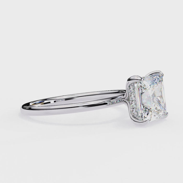 The Princess Solitaire with Hidden Halo Engagement Ring showcases the timeless beauty of a princess cut diamond at its center. Known for its clean, angular lines and modern appeal, the princess-cut creates a striking focal point. What makes this design unique is the hidden halo beneath the center stone, adding an extra layer of subtle brilliance that’s only visible from certain angles. This creates a captivating glow, enhancing the beauty of the diamond without overshadowing its shape.