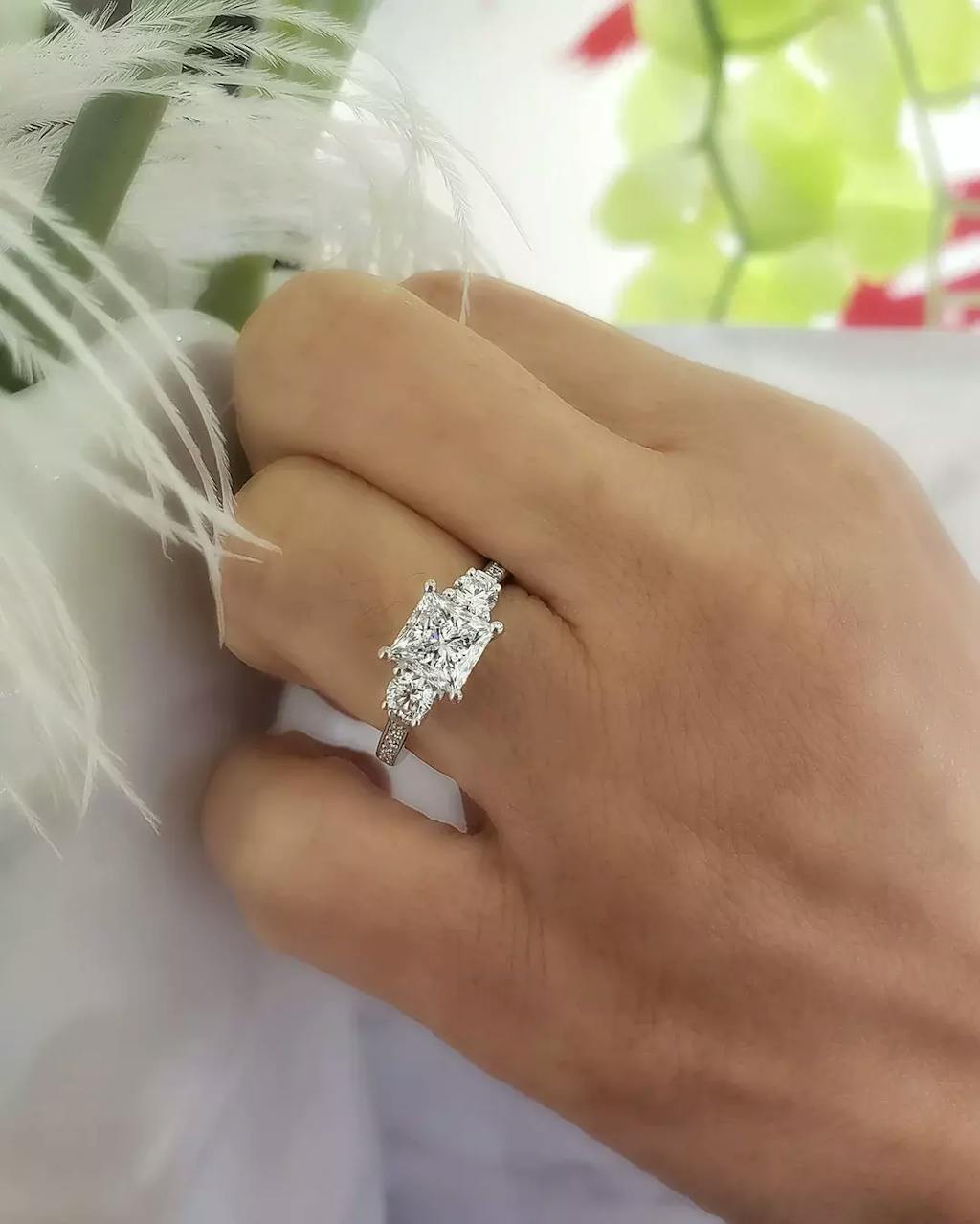 • Platinum Three Stone Engagement Ring – A durable, luxurious setting for long-lasting beauty.