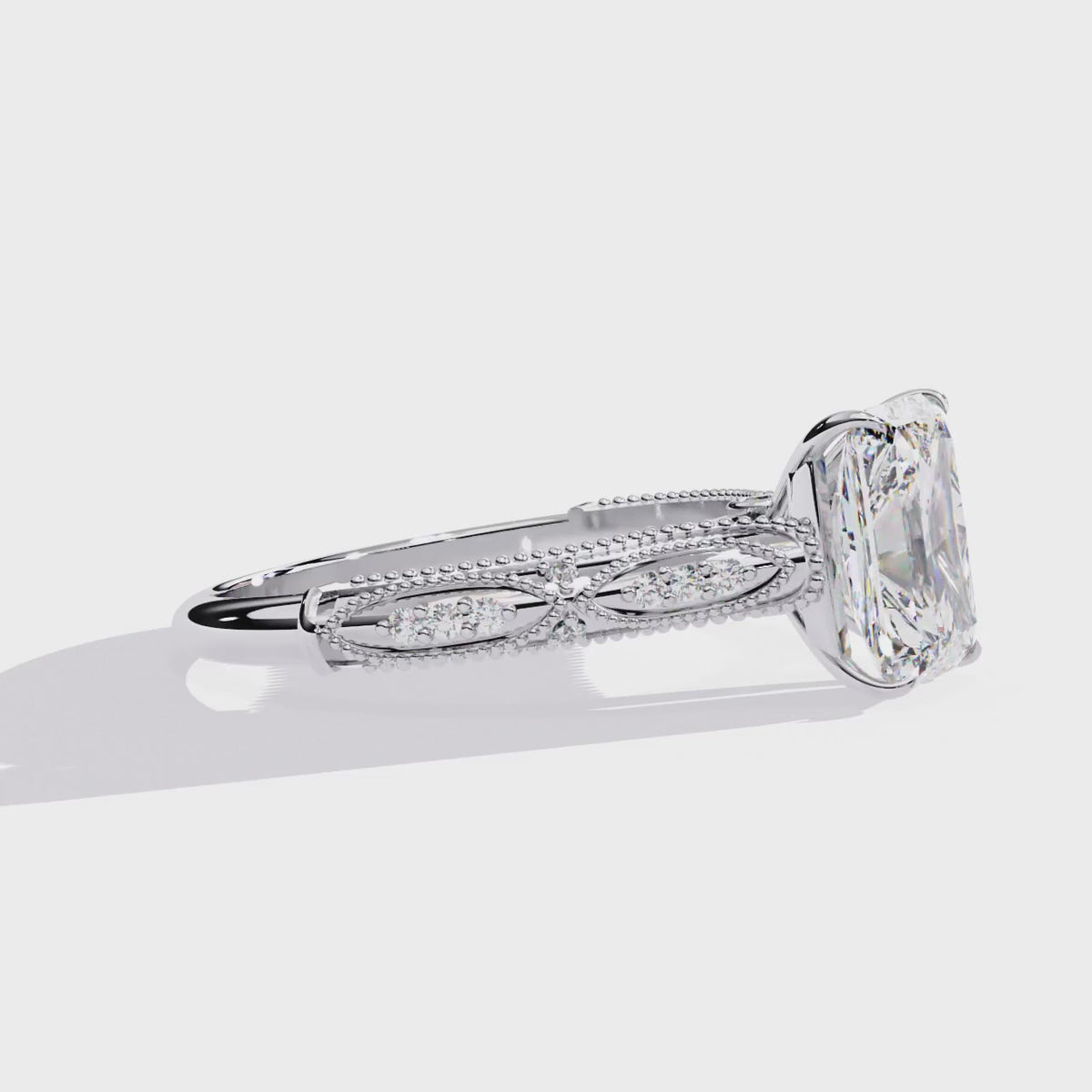Adding a touch of vintage allure, intricate milgrain detailing adorns the band, creating an elegant, heirloom-inspired look. This delicate beadwork enhances the ring’s artistry while maintaining a refined and classic appeal.