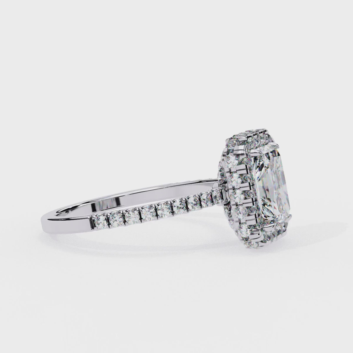 A Radiant Unique Halo Engagement Ring combines the elegance of a radiant cut center stone with a halo of smaller diamonds, enhancing its brilliance and creating a captivating design. This style offers a modern twist on classic halo settings, providing a distinctive and sophisticated look.