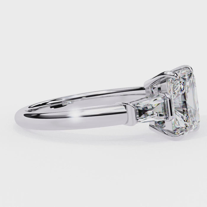 • Baguette Side Stones: On either side of the radiant center stone, two sleek baguette-cut diamonds add a touch of elegance and enhance the overall sparkle. These rectangular stones provide a modern twist to the classic three-stone design.