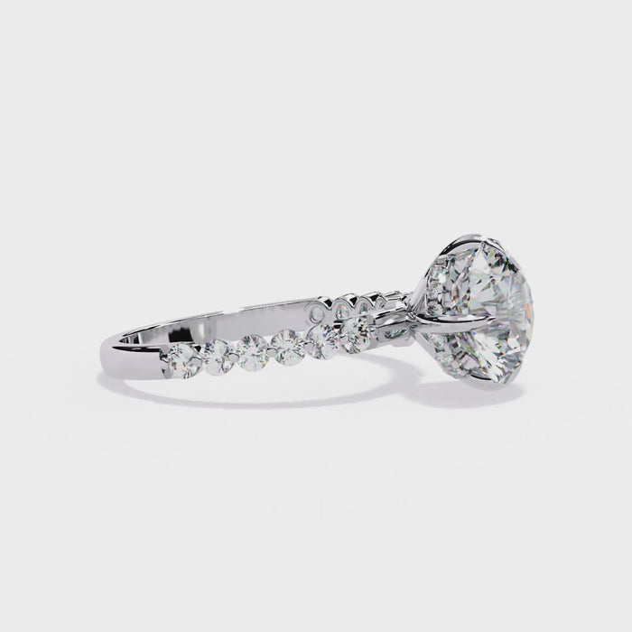 Our Round Hidden Halo with Shared Prong Engagement Ring is designed with precision and attention to detail. The hidden halo setting adds an extra layer of radiance, while the shared prong band ensures a secure yet stunning arrangement of accent stones.