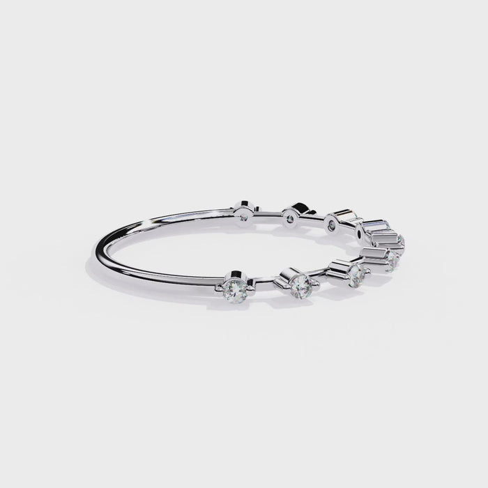 Crafted with precision, this band features brilliant round cut stones meticulously set in a space prong setting. The subtle spacing between the stones allows for extra light reflection, enhancing the brilliance and sparkle of each gem. The half eternity design offers the perfect balance of sophistication and comfort, making it ideal for daily wear.