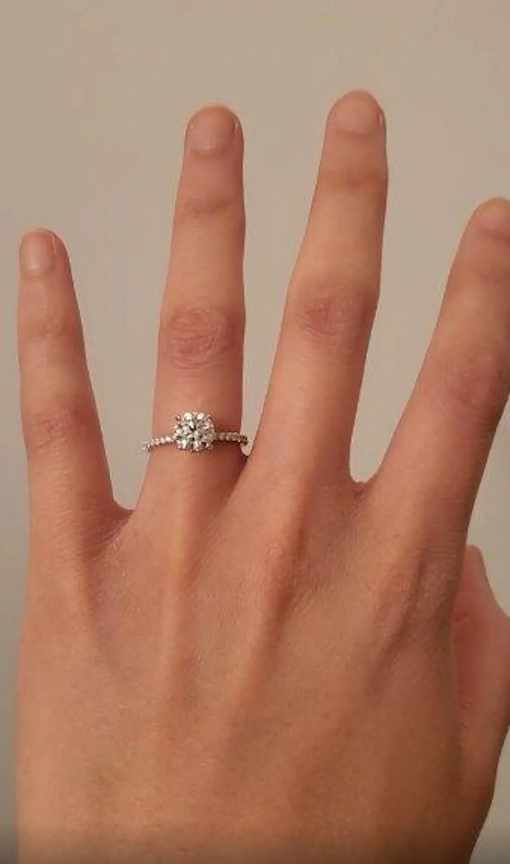 A dazzling round brilliant-cut diamond takes center stage, known for its unmatched fire and brilliance. Its perfectly symmetrical facets reflect light beautifully, creating a radiant focal point.