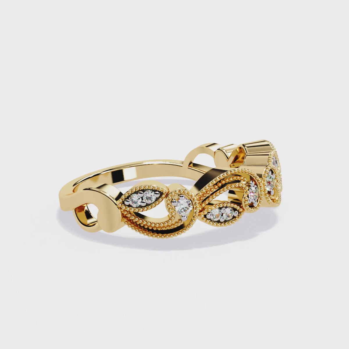 Crafted with lab-grown diamonds or moissanite, this wedding band is available in 14k and 18k white, yellow, or rose gold ensuring lasting beauty and durability. Each band is designed with precision to capture the elegance of vintage styles while offering the brilliance of ethically sourced stones.